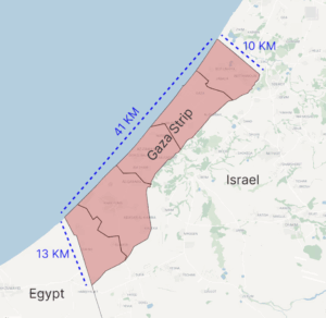 The Gaza Strip, with a population of about 2.1 million, is 360 sq km in area, 41 kms long, 13 kilometres at its widest, about 5 kilometres at its narrowest, and about 10 kilometres at the top. To put that into context, it’s less than half the size of Canberra – population 483,000.